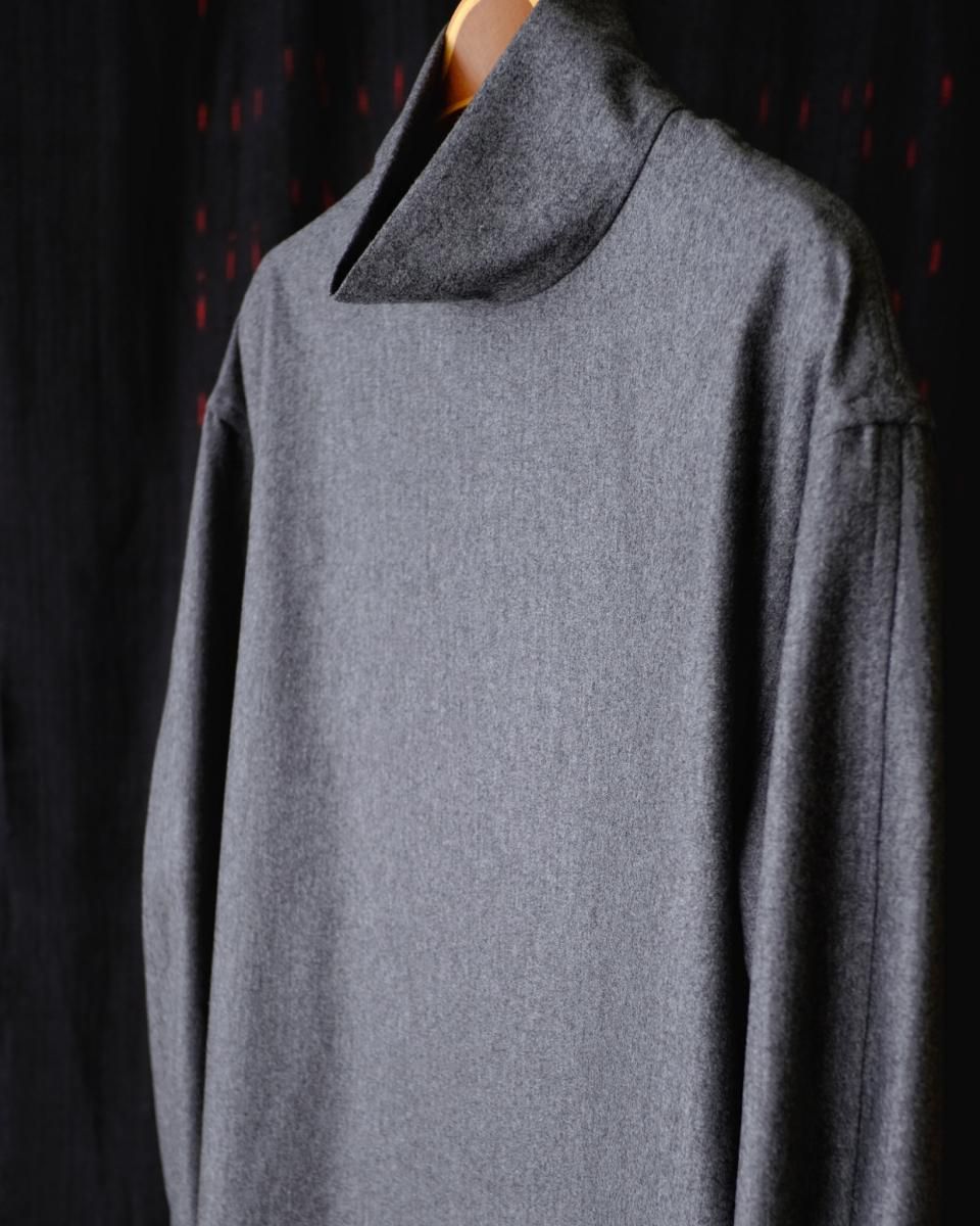 素材には、経糸にカシミヤブレンドの紡毛糸、緯糸に梳毛糸を用いた高密度ウールポプリンを使用。 薄手でありながらしっかりとしたハリと密度があり、まさに“ニットの代わり”になるブラウスです。 このあたりの上質な素材使いは、LOEFFらしさを感じる部分でもあります。
