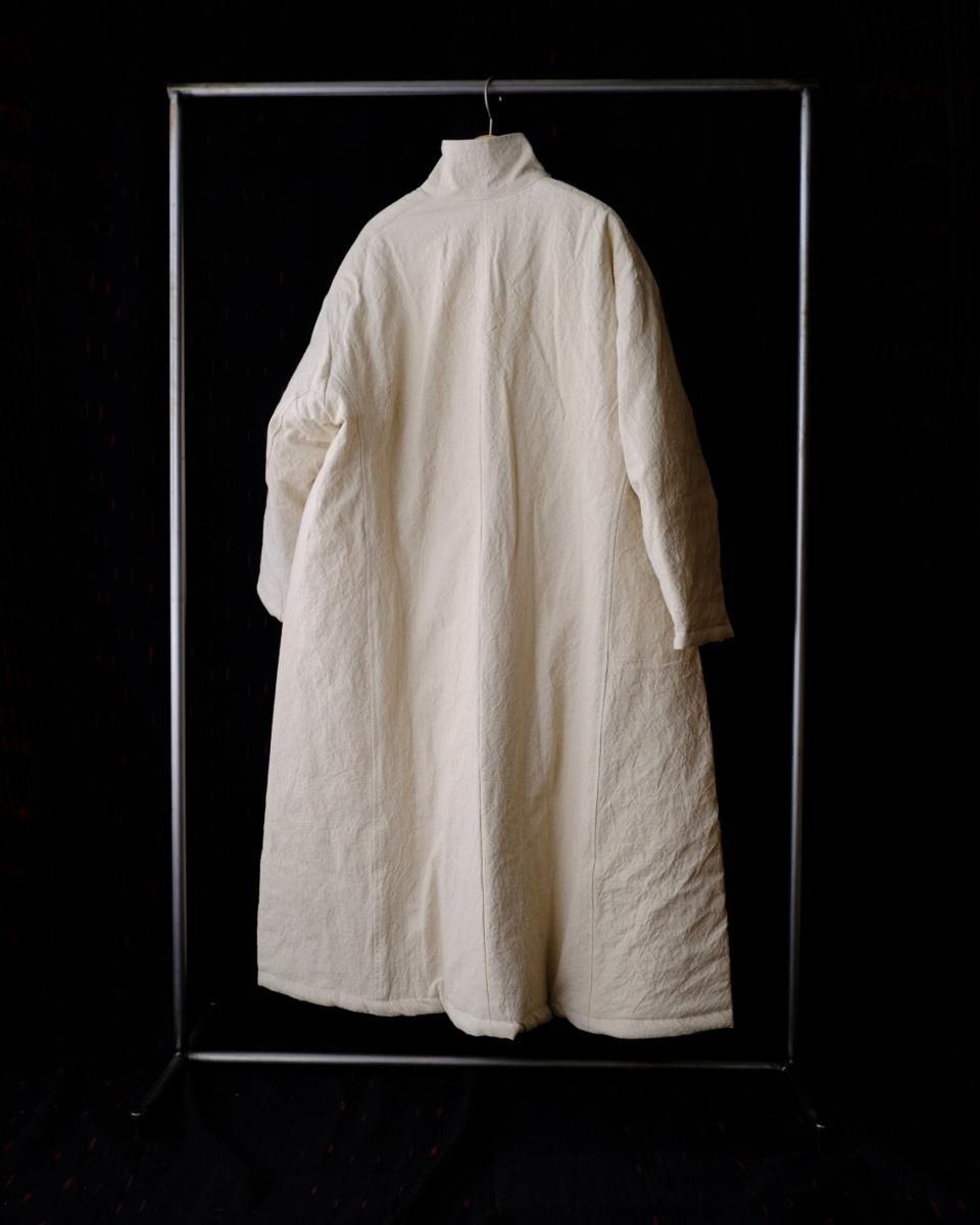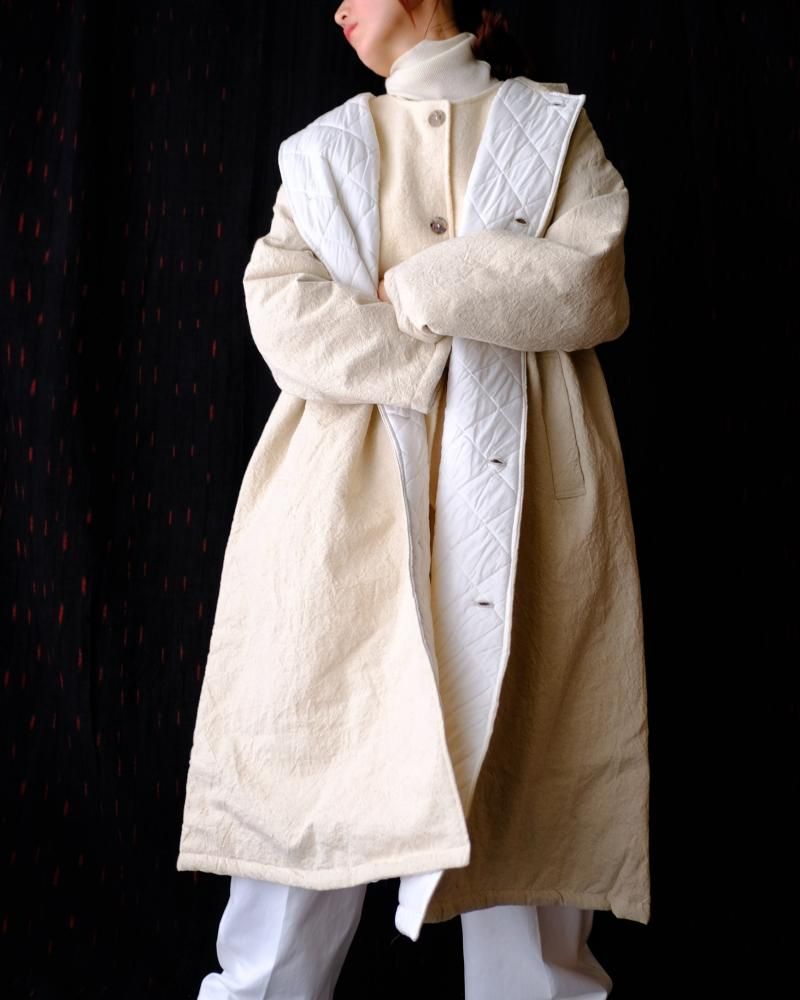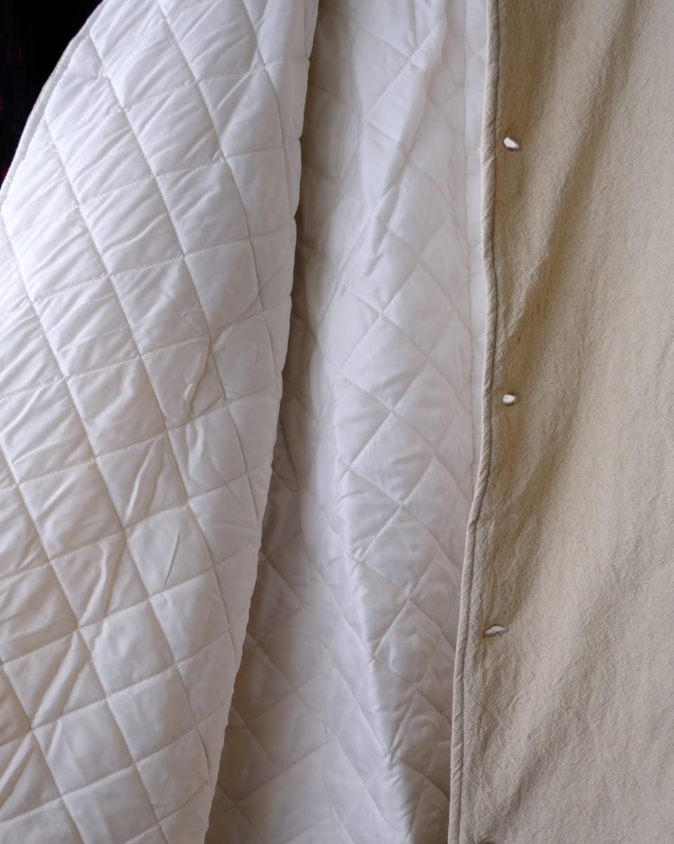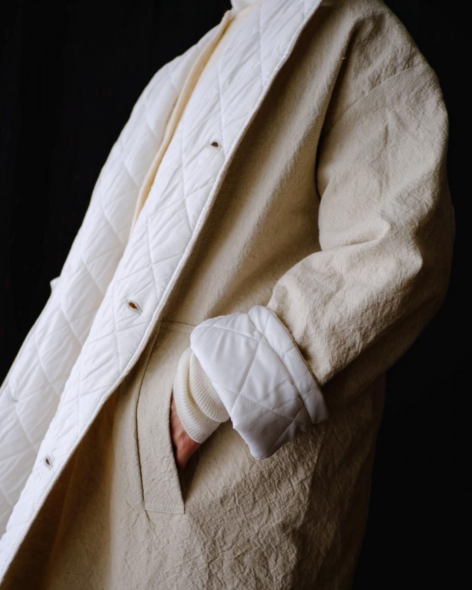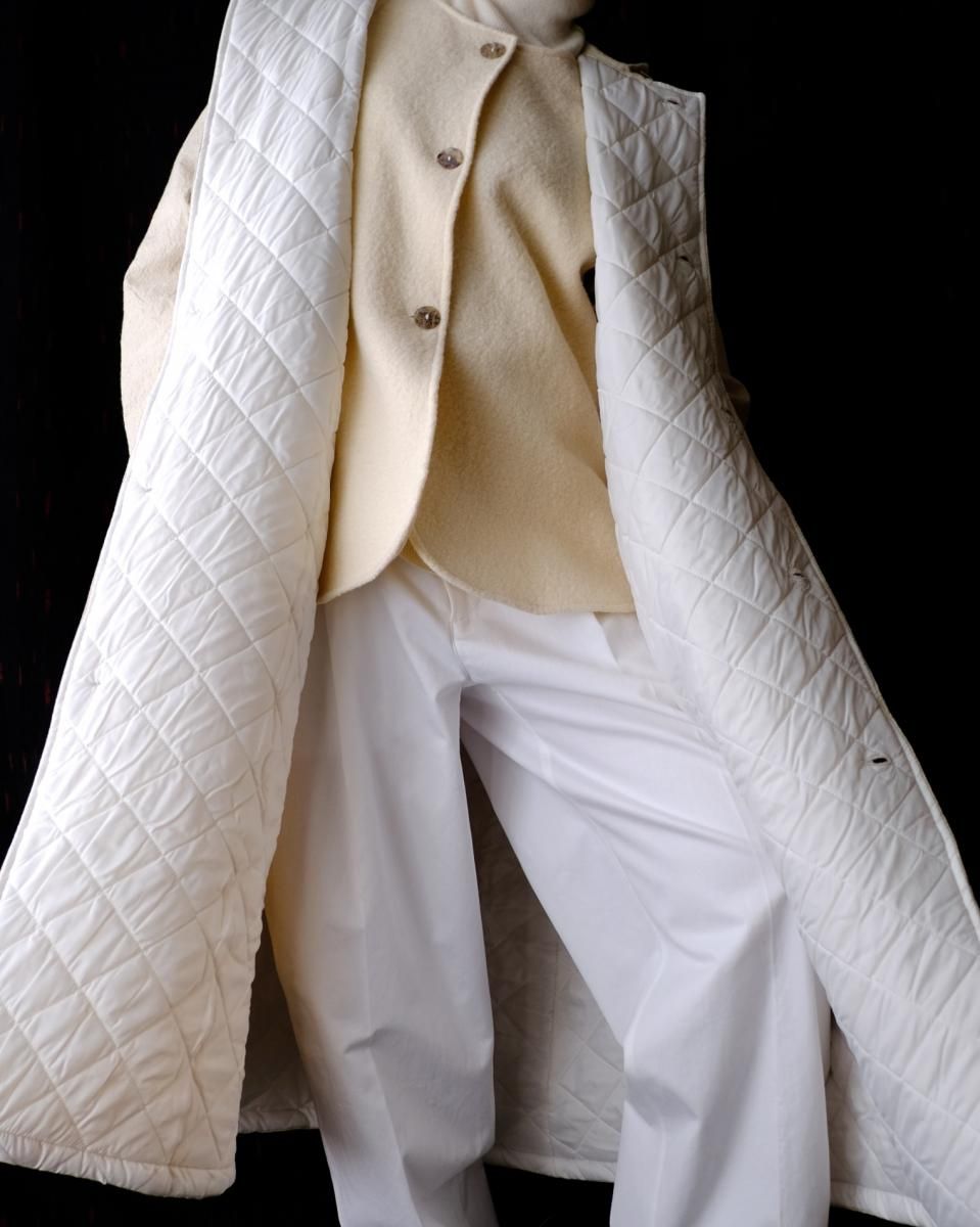 内側には美しいホワイトのキルティングを採用。 ばさっと羽織り、袖口や前立てを少し折り返してキルティングを見せれば、ローブのようなニュアンスも生まれます。 また、小ぶりな襟は立たせても形がよく、首元にメリハリが出てマスキュリンな雰囲気で着られるのもポイントです。