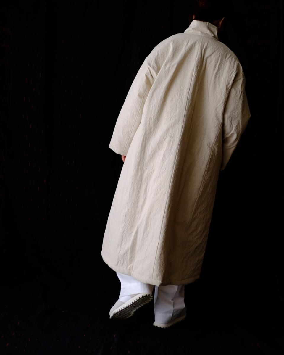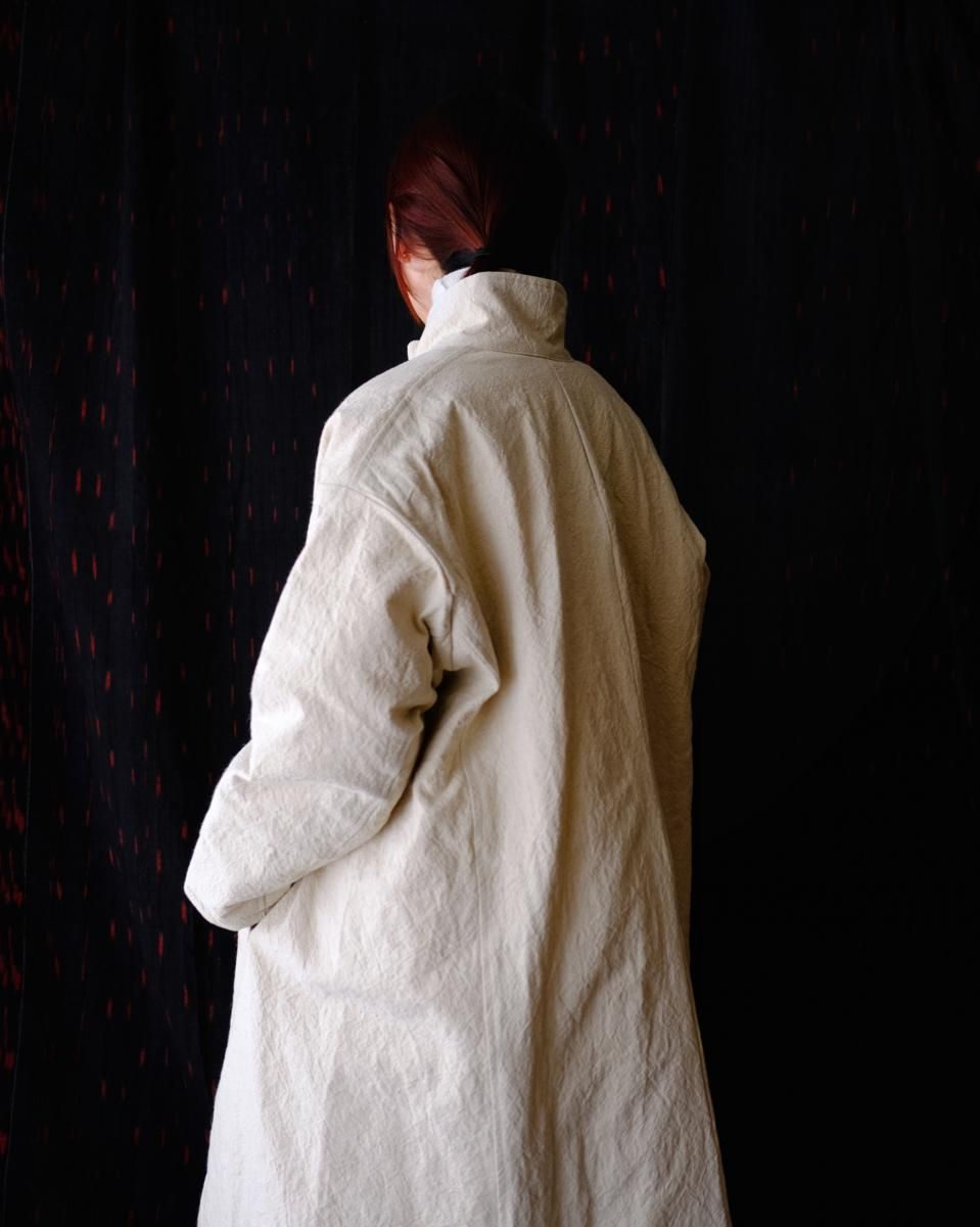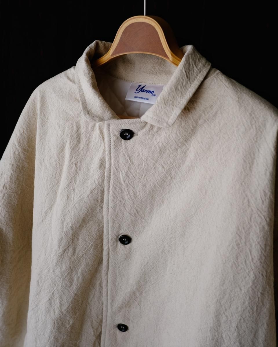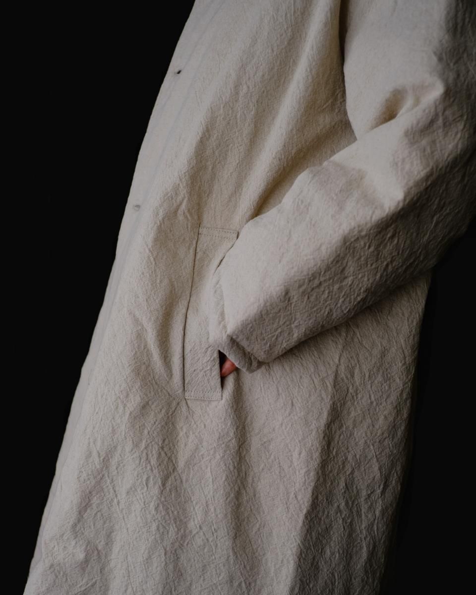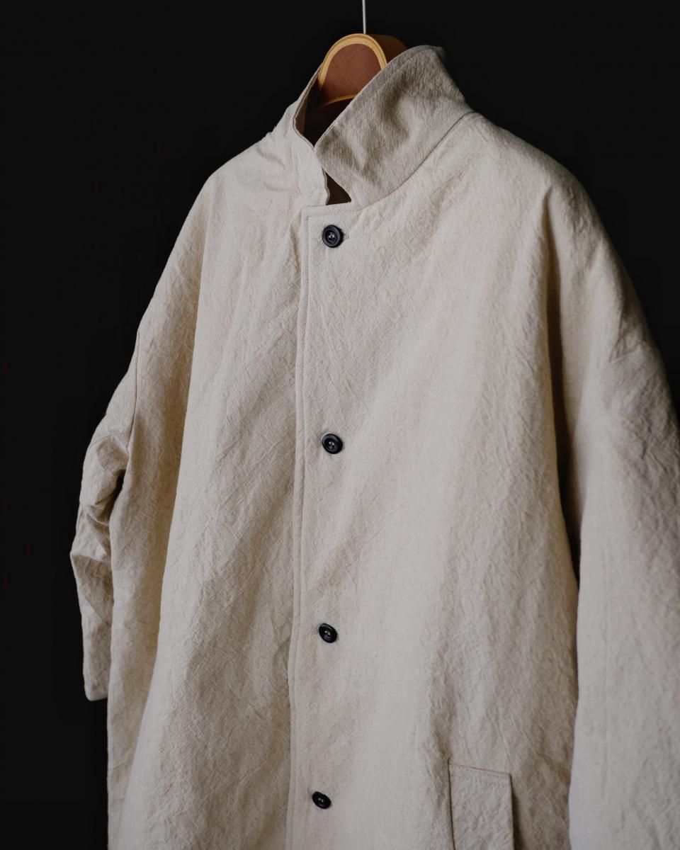 Yarmoの秋冬の定番である「Lab Coat」は、洗いのかかったコットンリネンのナチュラルな表地と、裾に向かって大きく広がるAラインシルエットが魅力。 見た瞬間に「これは面白く料理できそうだ」と感じ、セレクトした一着です。