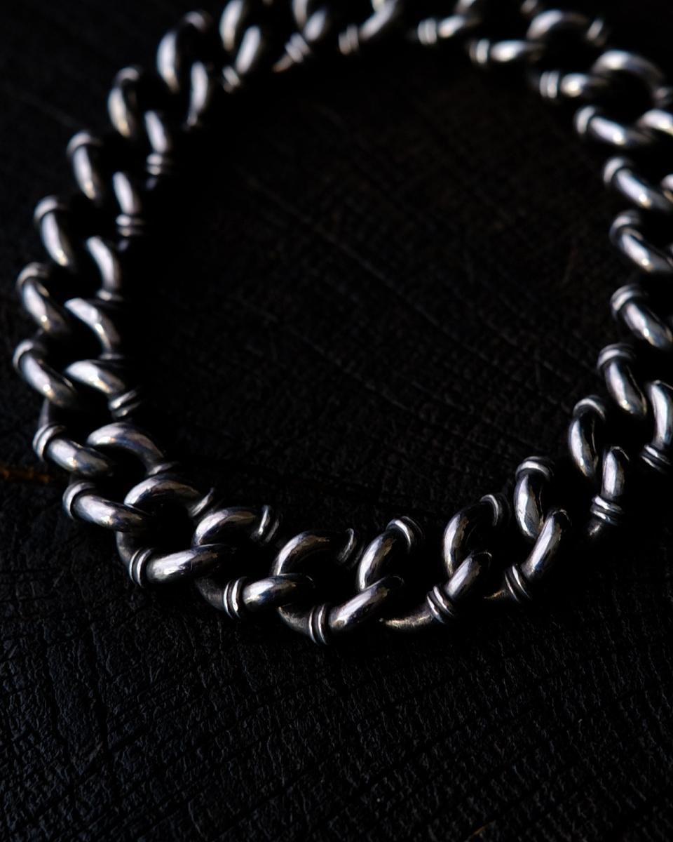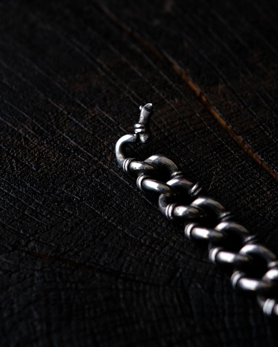 各コマは職人の手作業により一点一点丁寧に繋がれ、チェーン全体の立体感と存在感をより豊かに引き立てています。
