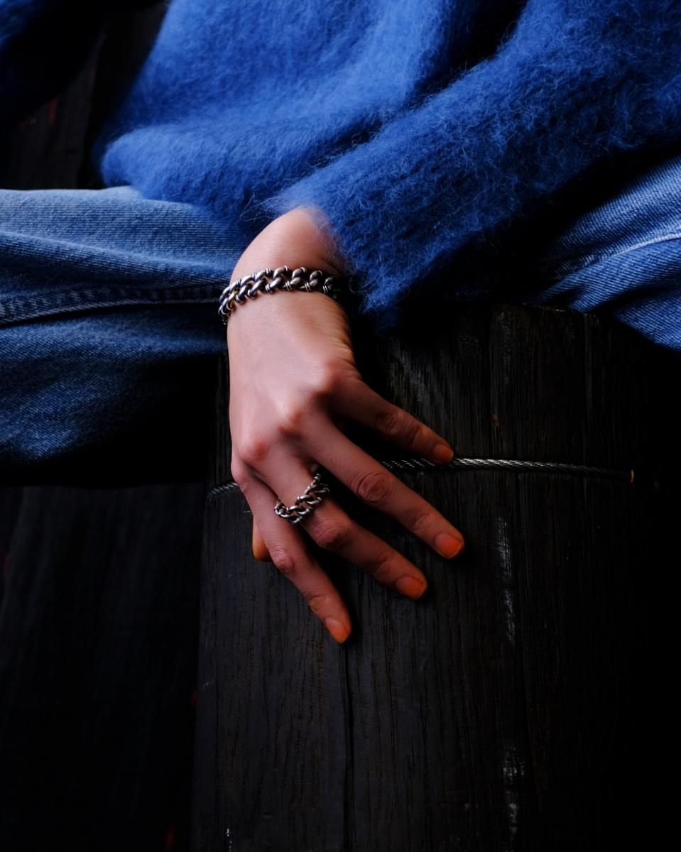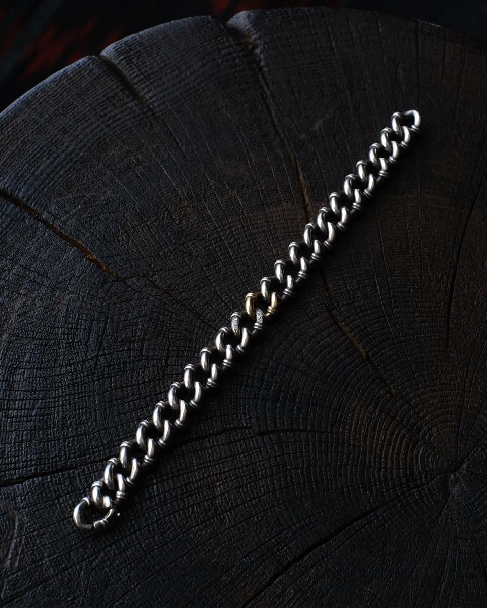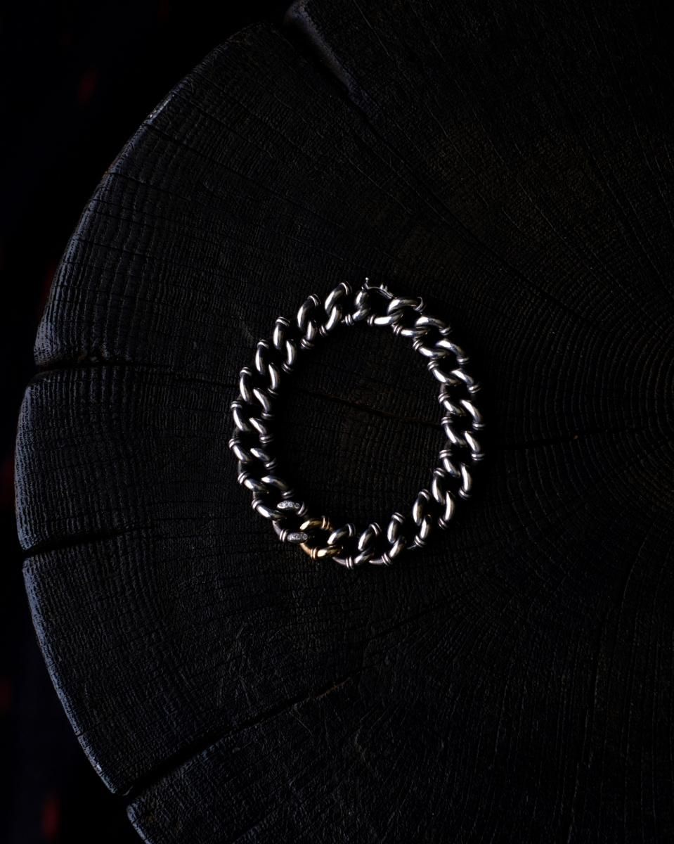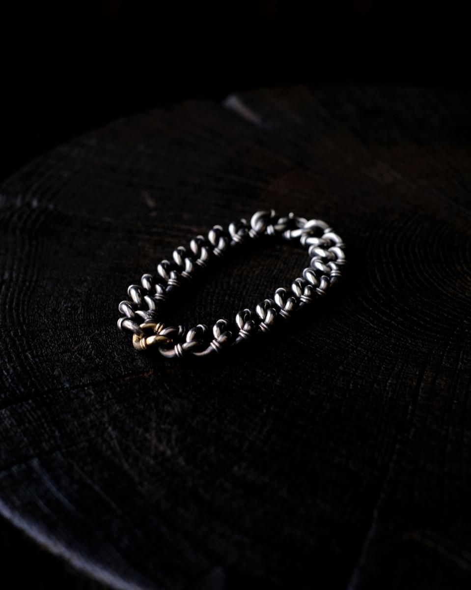 1930年代のイギリス製チェーンブレスレットをデザインソースに、各コマには独自の美しいディテールが彫り込まれ、他にはない繊細で立体的な表情を持つアイテムです。
