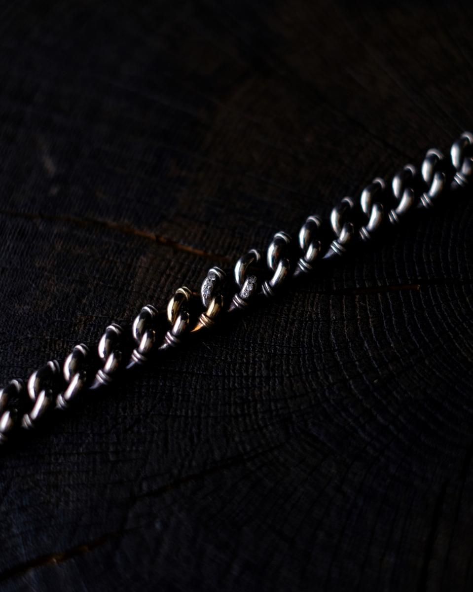 各コマは職人の手作業により一点一点丁寧に繋がれ、チェーン全体の立体感と存在感をより豊かに引き立てています。
