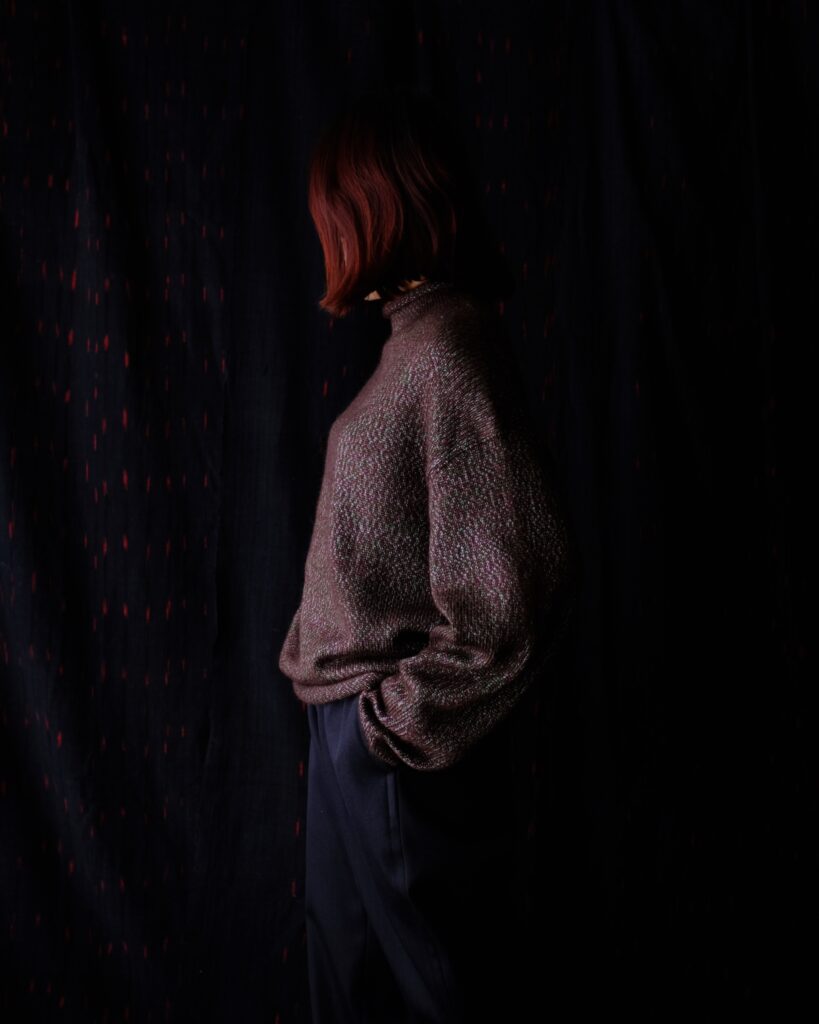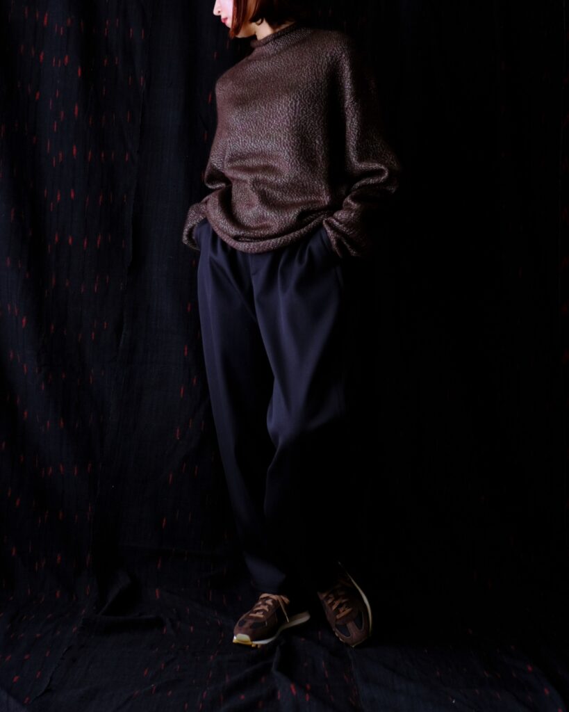 糸の選定から編み地の構成に至るまで、一般的なニットの理論にとらわれない独自のアプローチで設計されており、着る人の体に自然に寄り添いながら、見る人の目を惹く圧倒的な存在感を放ちます。